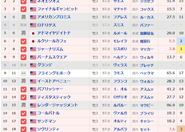 枠が遠いものの、3走前で当地の勝ち鞍があること。馬場が悪いのに猛ペースになりそうなので、後方一気を狙うこの馬にも展開が向くとみている。フロリダダービーから過去5頭も馬券に絡んでいることも追い風。