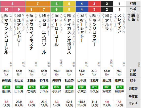中央デビューからだいぶ時間がかかったが、南関東OPまで登り詰めた。転入馬、不調馬と注文のつく馬も多い中での数少ない好調馬。斤量54kgがかなり大きいと思っている。