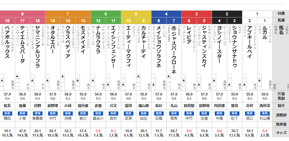 穴馬からはこの馬。重賞では今一歩という所だが、行った行ったの競馬になるとこの馬の出番。行きたい馬も多いが、本当に先手がとれそうなのがこの馬の可能性もある。