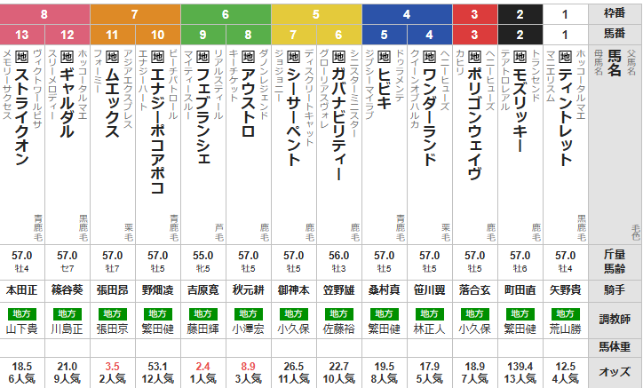 前走アメリカではメディカルチェックで引っかかってしまい無念の帰国。補助金や登録料返還でどうにかなったが、わざわざアメリカまで吉原騎手が同行したので、何もできなかった悔しさをここで晴らす。帰国後は順調。