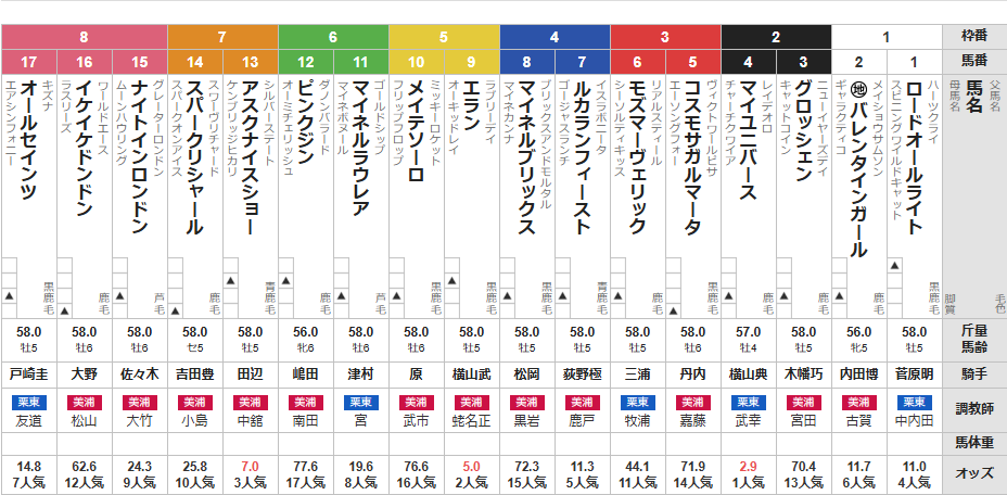 菊花賞後の自己条件に戻るが、とにかく末脚が安定している。馬体増が心配されるが、しっかり乗り込んだので問題ないとのこと。ひょっとしたらまた逃げる可能性もありそう。