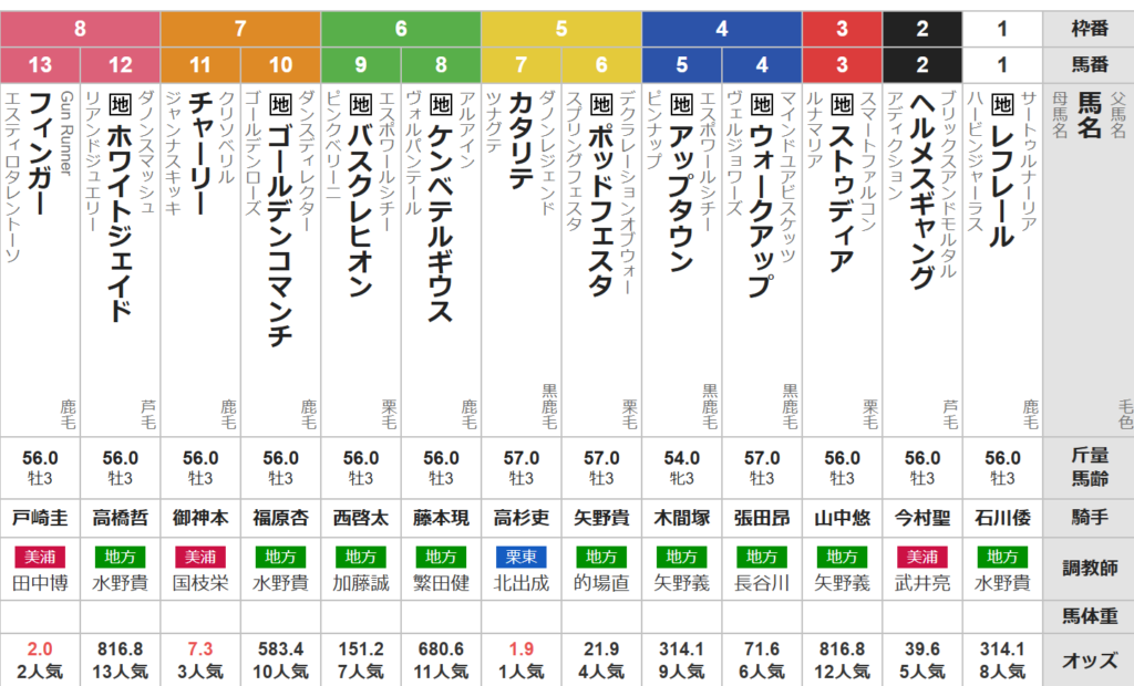 だいぶ有力馬が出てこないので、この馬の出番がやってきた。ハイセイコー記念では後塵を拝したが、その相手は今回出てこない。好枠でもあり自在性もあるだけに、ここはチャンスか。